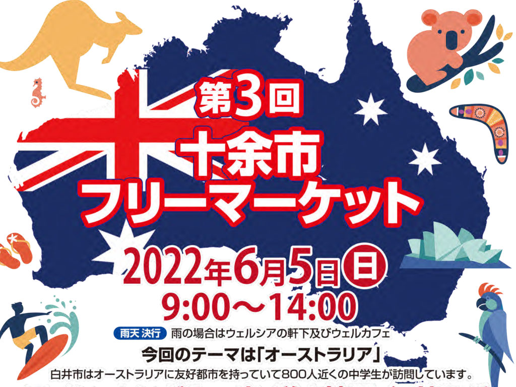 だんだんイベントが復活してきました! 6月5日(日)9:00〜12:00 千葉県白井市にある、 ウエルシア白井十余一店の駐車場で 「十余市フリーマーケット」が開催されます。 今回のテーマは「オーストラリア」 ということで、 オーストラリアに関... -